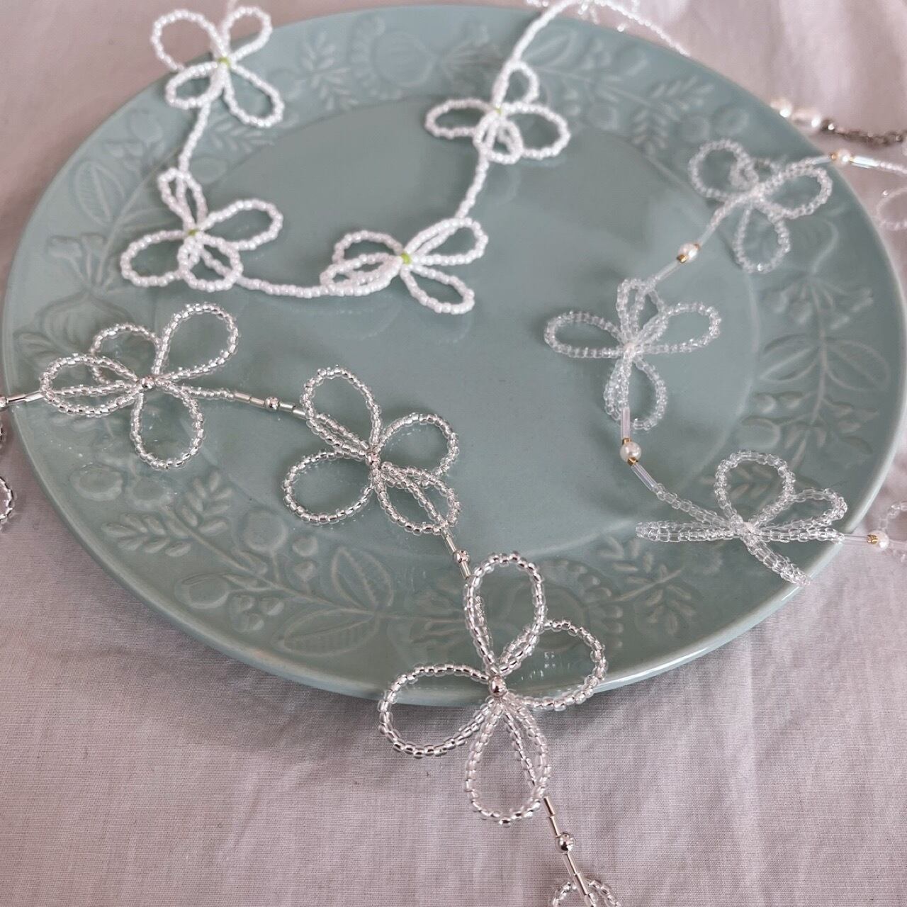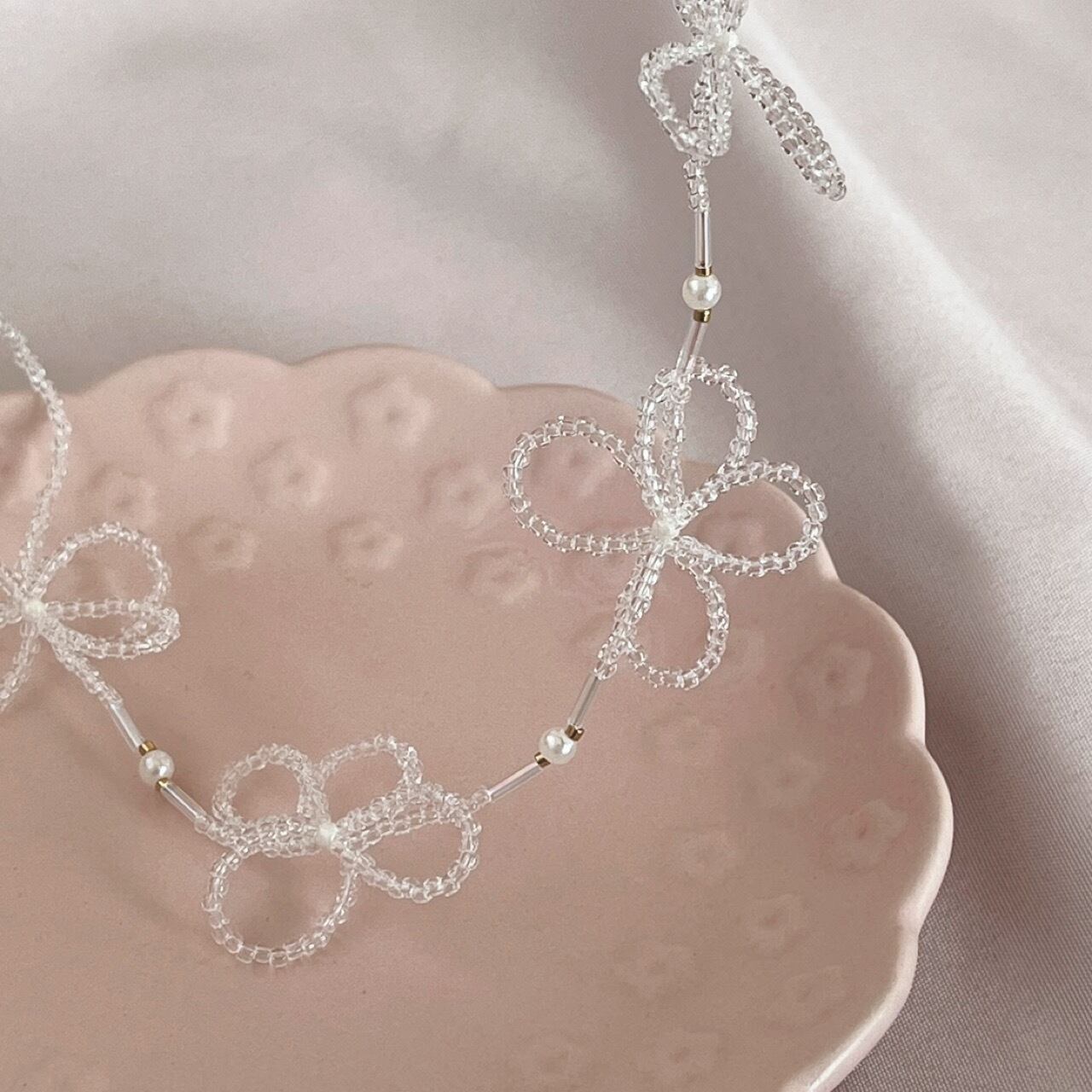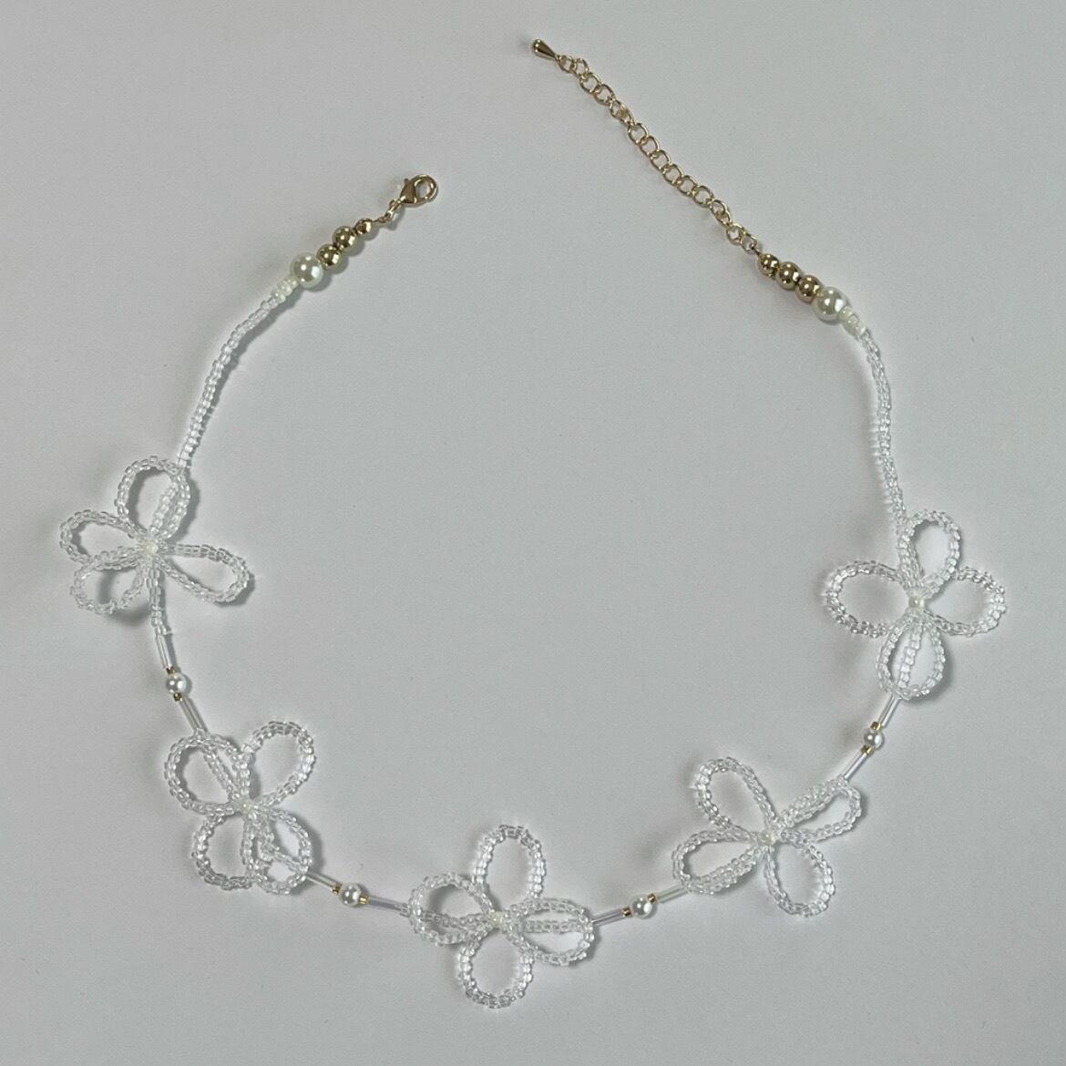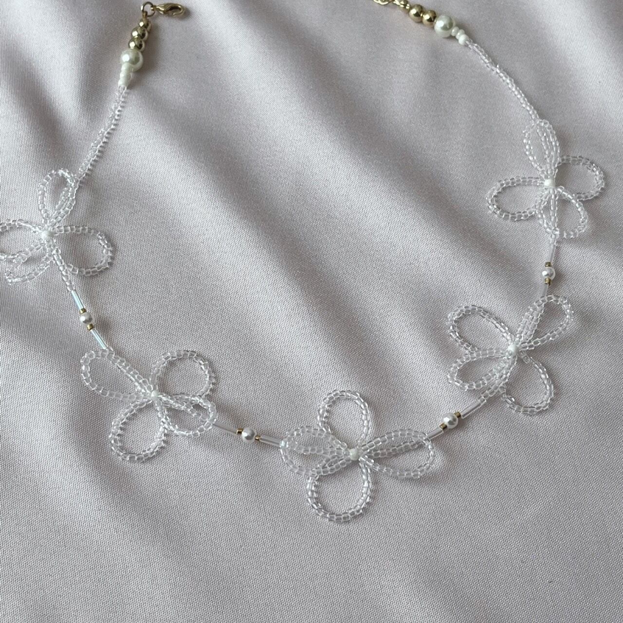 お花がモチーフのビーズネックレスです。透明の花びらに蕾部分は白色です。パールとゴールドのビーズで可愛らしくアクセントをつけています♡