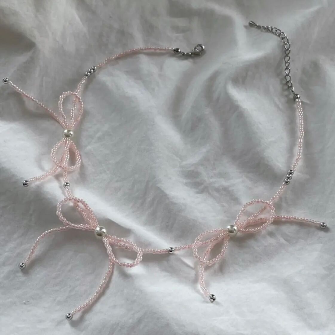淡いピンク色とガラスパール、シルバーの小さなメタルビーズでお作りしております♡
