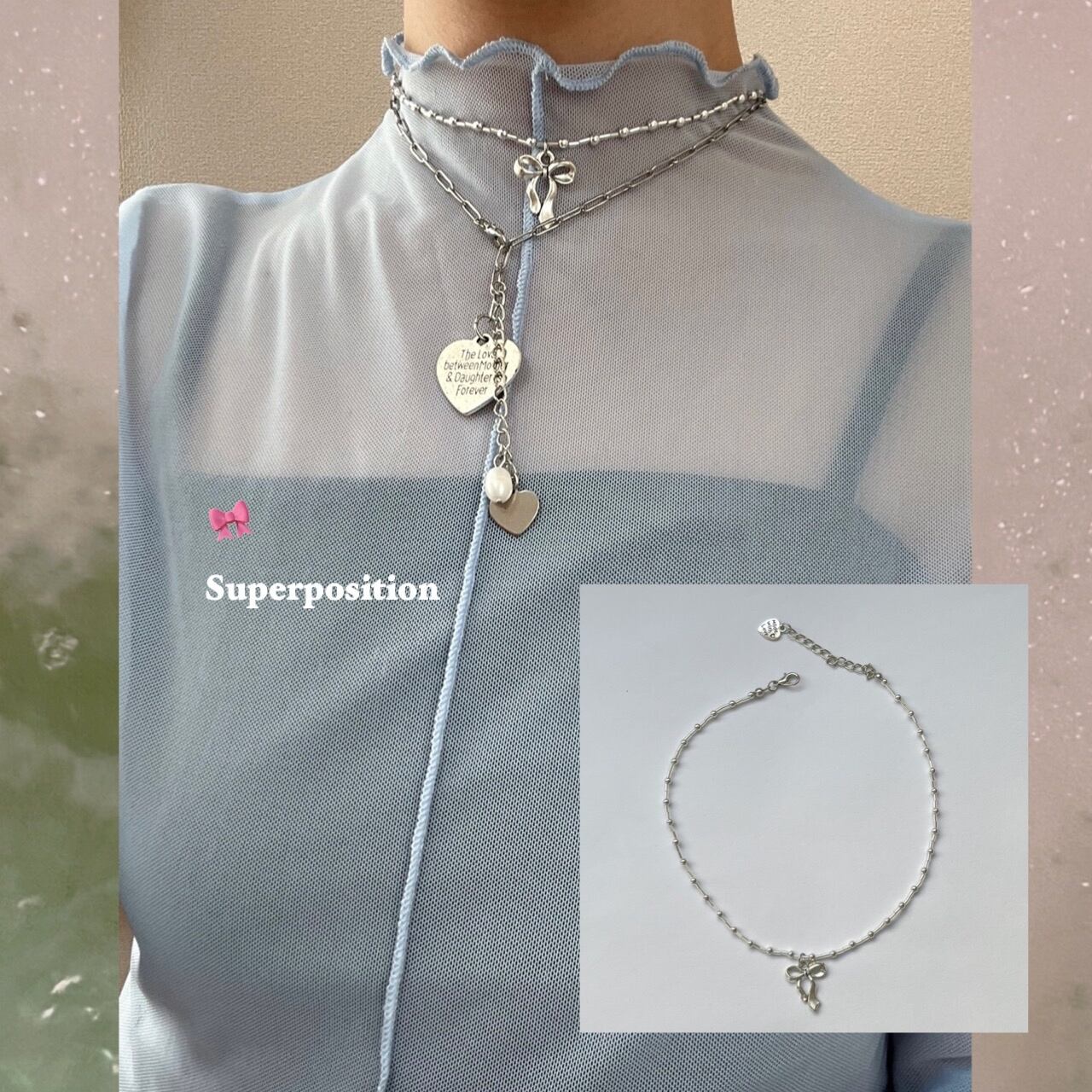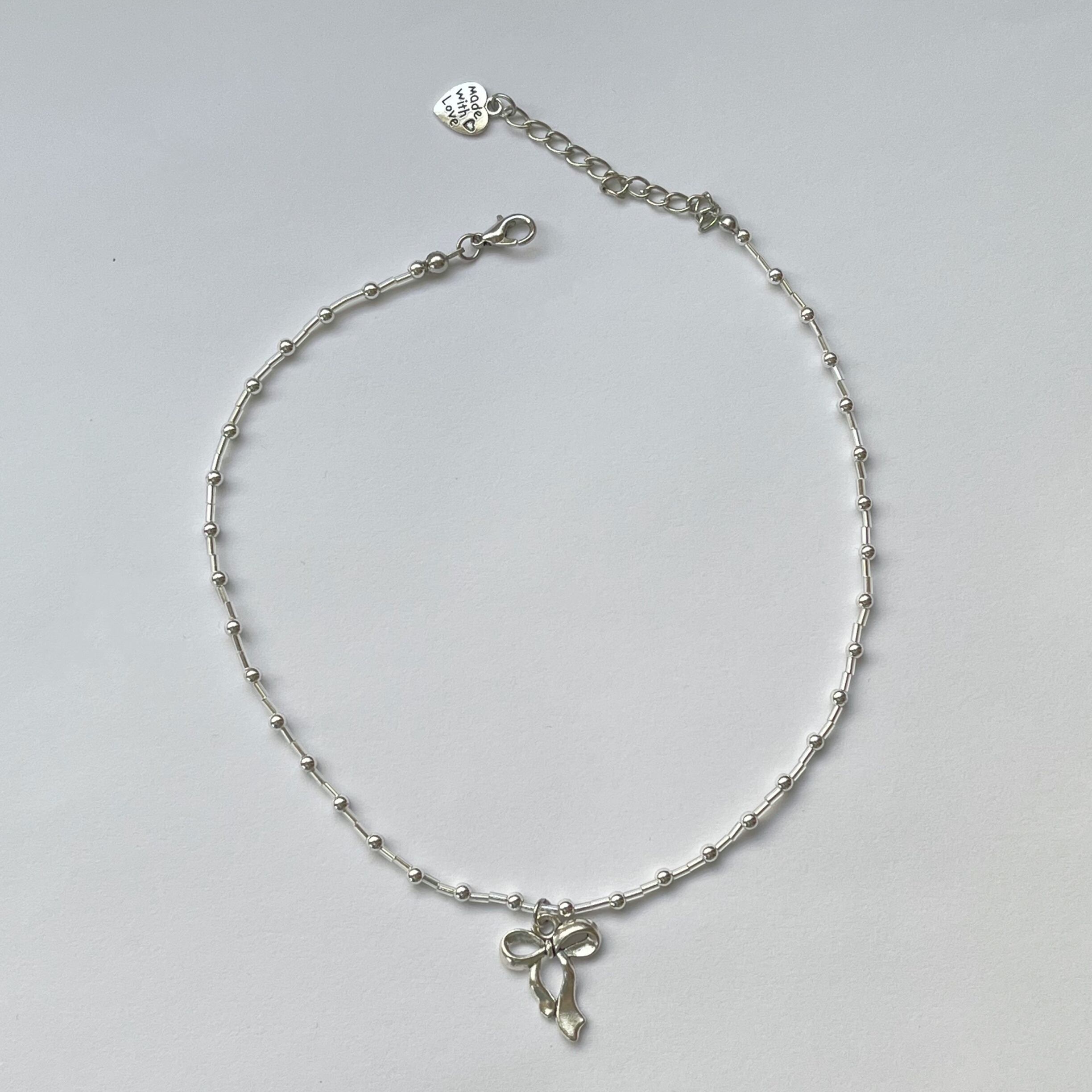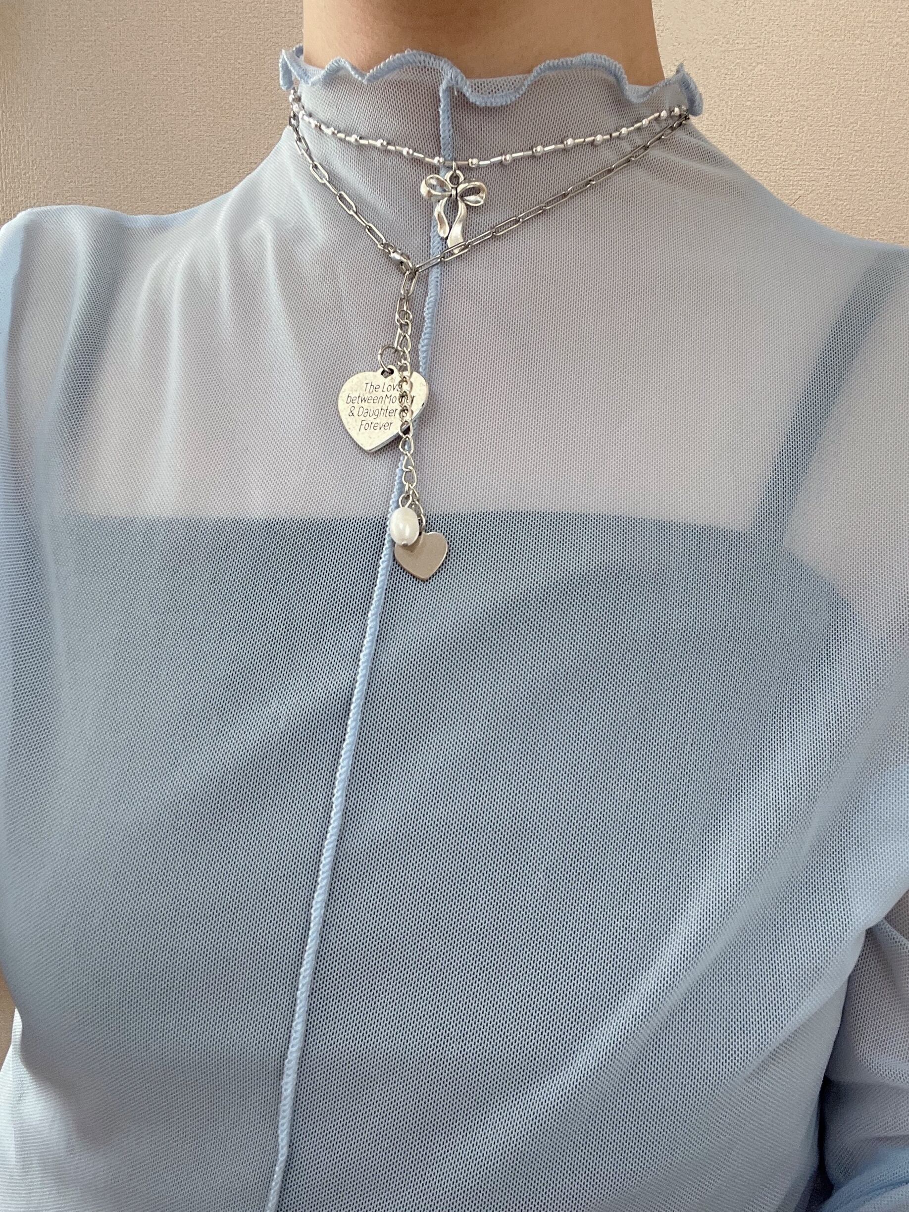 シンプルはシルバーのビーズ・リボンネックレス。